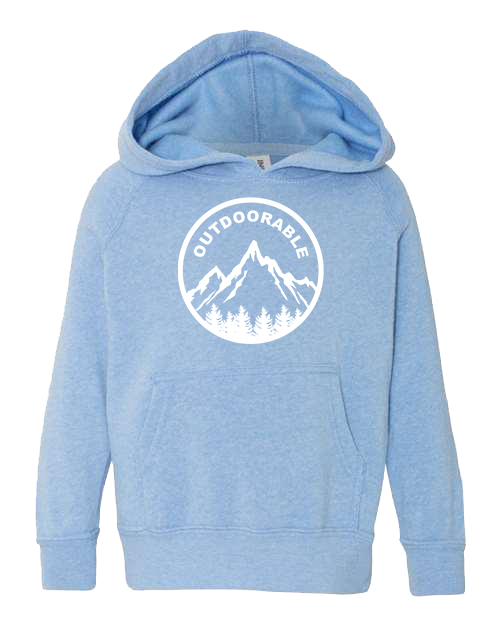 Super soft sky blue hoodie made of 52% cotton 48% polyester printed with our Outdoorable design in white ink.
